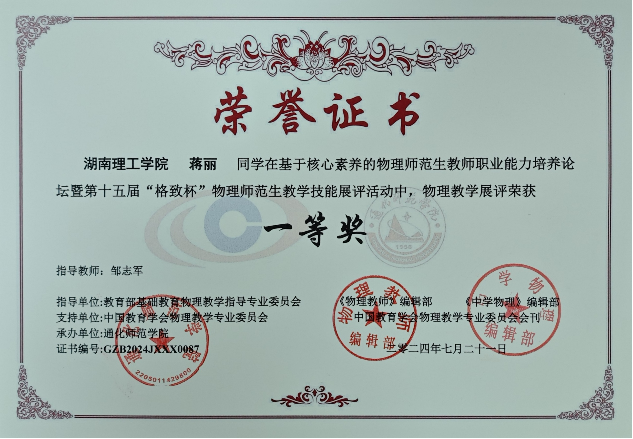 我校物理与电子科学学院选派的物理学专业本科生和学科教学(物理)专业研究生经过紧张激烈的角逐,凭借扎实的教学基本功和出色表现,取得一等奖5项、二等奖12项、三等奖5项的优异成绩,李奇云、邹志军等教师被评为“优秀指导教师”,我校荣获优秀组织单位奖。蒋丽同学被推荐参加赛后的优秀选手集中展评,这是我校选手第三次获此殊荣;此外,我院2018级校友、华中师大研究生陈梦妮同学也被推荐参加赛后的优秀选手集中展评;在闭幕式上,蒋丽同学多个亮点被点评专家作为范例。