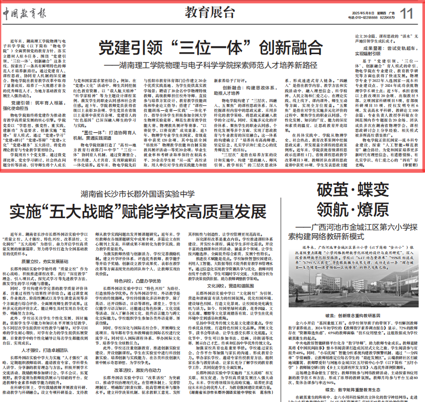 基于“党建引领、‘三位一体’、创新融合”育人模式的牵引,物电学院在专业建设、教育教学研究等方面也获得了快速发展。物理学专业于2022年入选国家一流本科专业建设点,于2024年成功获批物理学学术硕士点;近5年,承担省级以上教改项目20余项,出版教材5部,立项国家科研项目5项、省部级科研项目33项,授权发明专利6项,发表高水平科研、教研论文100余篇;专业负责人教授李科敏在全国范围内作专题报告20余场,团队成员多次在湖南省物理学会、课程思政研讨会上分享经验,相关模式被多所高校借鉴推广。