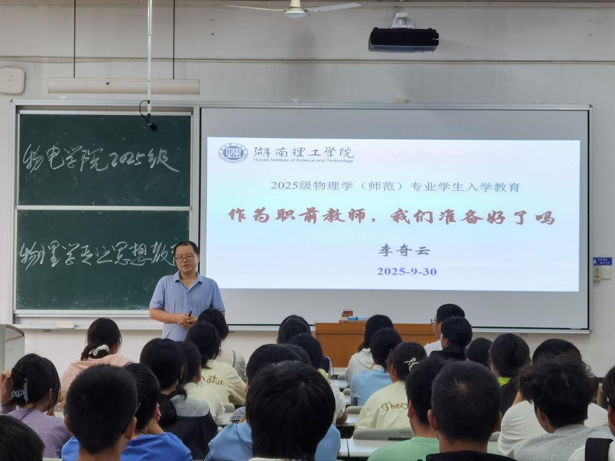 物理学(师范)专业由教研室主任李奇云主讲,介绍专业培养模式、目标及课程体系,帮助新生深化认知围绕“学高为师,身正为范”强调师范生素养,解读专业特色教育平台、师资及毕业生质量,并为新生适应大学生活、完成角色转变、规划生涯提供具体建议。