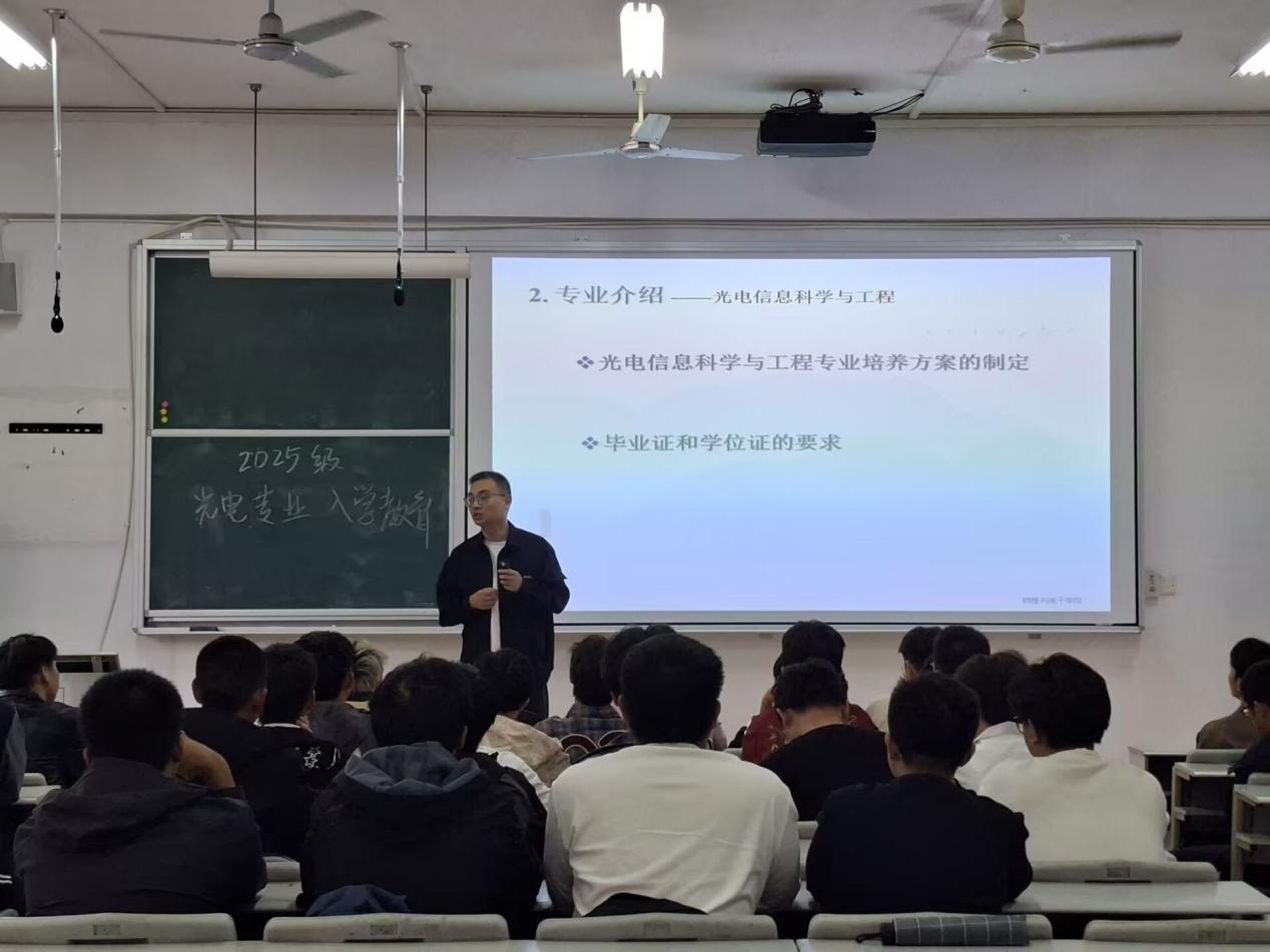 光电信息科学与工程专业教研室主任金佳鸿博士主讲。他介绍学院实验室、仪器设备及领域优秀教师,鼓励新生多进实验室交流、重视实践以提升动手能力;解读专业培养方案,强调基础专业课的“垫脚石”作用,同时为新生做细致的就业分析。
