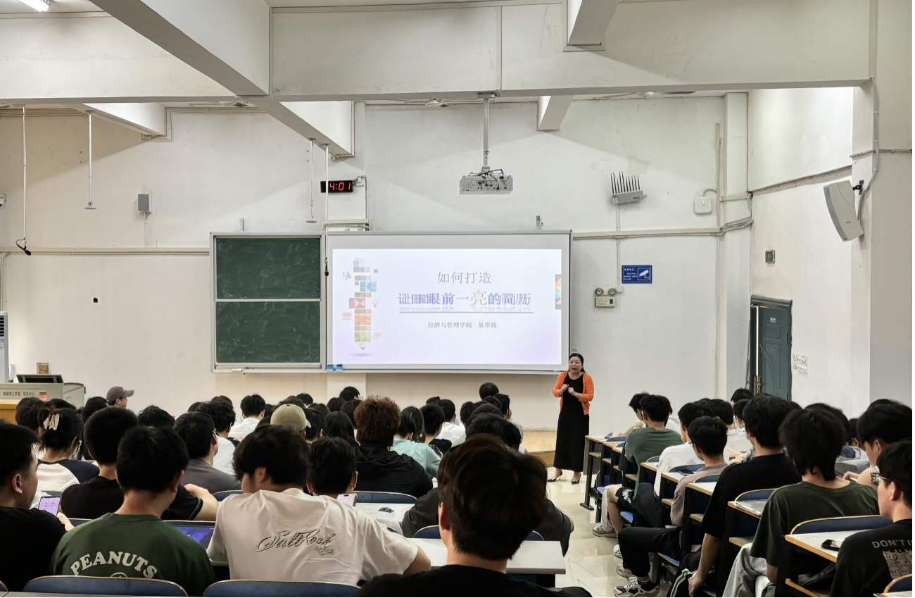 4月11日下午,我校经济与管理学院副院长、副教授易翠枝博士受邀为我院22级电子科学与技术等电类专业学生做题为《如何打造让HR眼前一亮的简历》讲座,160余人参加。