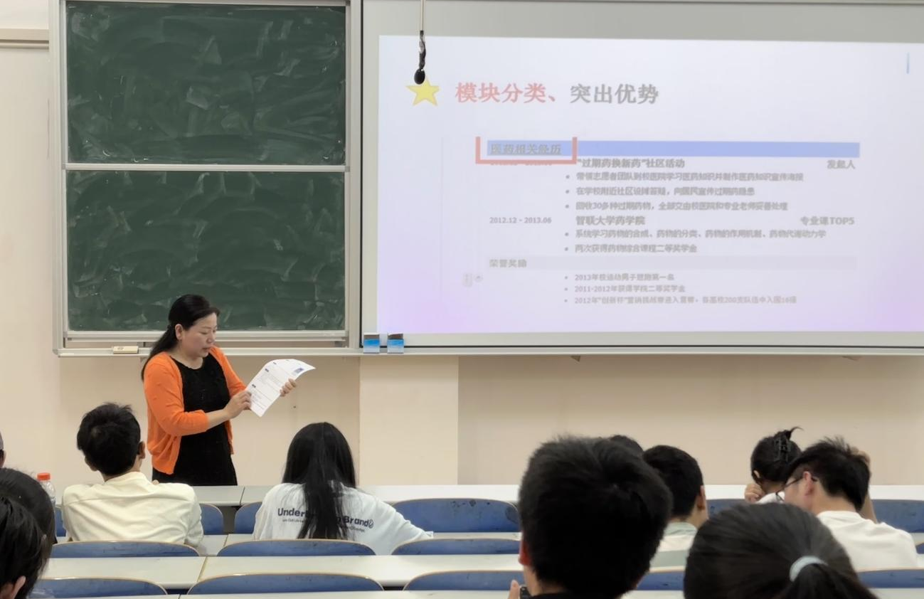 易翠枝以互动提问开场,了解学生就业意向,针对常见误区进行点评与建议。她结合实例详细讲解简历制作要点,强调个人信息需简明扼要、获奖情况应突出亮点、教育经历需逻辑清晰,并展示优秀简历案例供学生参考。她特别指出:“简历需精准匹配岗位需求,避免冗杂信息,将简历精简到一页纸,用数据与成果体现个人优势。”