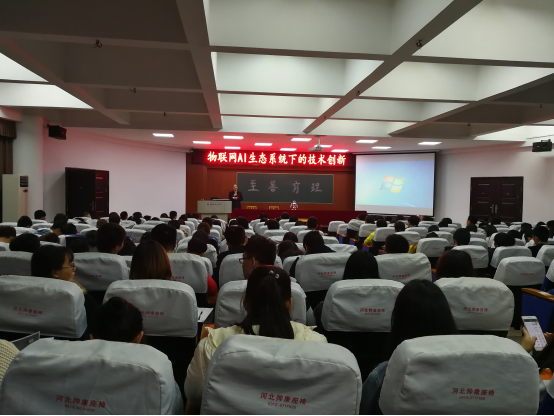 周工程师就人工智能进行了简要的说明,介绍当下物联网发展态势AI与物联网的关系、应用进行了具体阐述。通过人工智能与人类对战视频的播放,让同学们领略了人工智能的强大。周工程师指出:AI让物联网变得更加智能,物联网能凸显AI价值。时代在不断发展,家居也能智能化。周工程师就智能家居的原理进行了形象的具体阐述。讲座的最后,周工程师向同学们展示了公司研发出的机器人并鼓励同学们努力学习,勇于创新。会后和同学们一起深入的交流了公司最新的实验室产品。