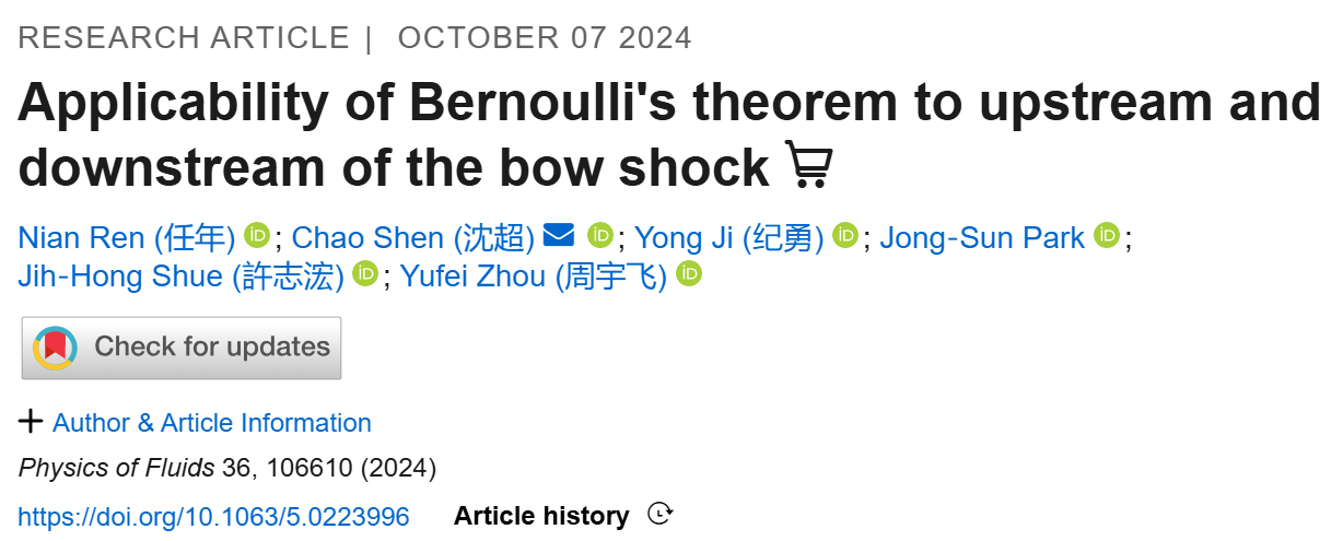 10月7日,我院任年博士在国际学术期刊《Physics of Fluids》(AIP美国物理学会出版)发表题为“伯努利定理对弓激波上下游的适用性”(Applicability of Bernoulli's theorem to upstream and downstream of the bow shock)的研究论文,该论文被中科院二区(JCR一区)收录。