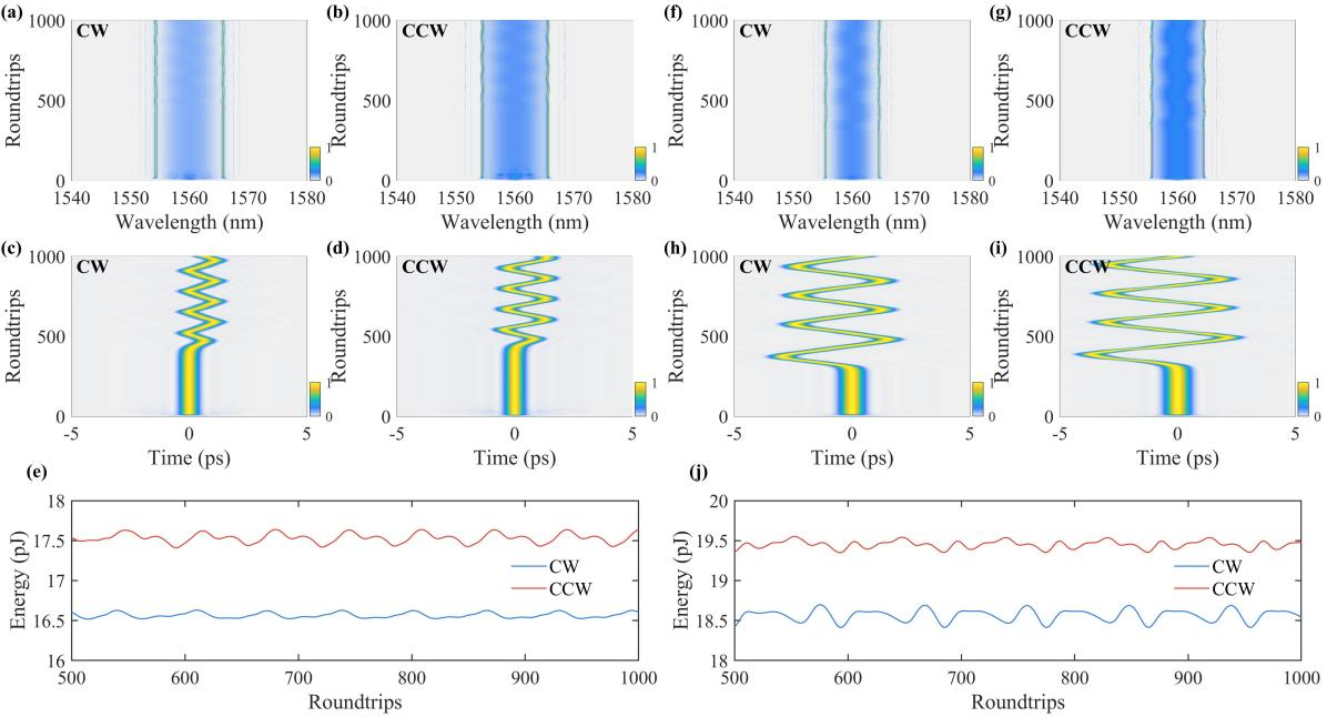 本论文以数值方式展示了在具有双向孤子光纤激光器中产生脉动和爬行动力学,如图3所示。结果揭示了四阶色散对这些动力学行为的影响。通过精心调节四阶色散参数,在激光器的顺时针和逆时针传播方向中观测到了不同脉动行为。值得注意的是,两个传播方向上的脉动幅度存在显著差异,这主要归因于激光腔内非线性效应与四阶色散之间的相互作用。此外,当四阶色散超出某一阈值时,纯四次孤子开始呈现缓移行为,其特征是脉冲在时间轴上的周期性位移。重要的是,通过调节四阶色散,可以实现对移动距离的精确调控。