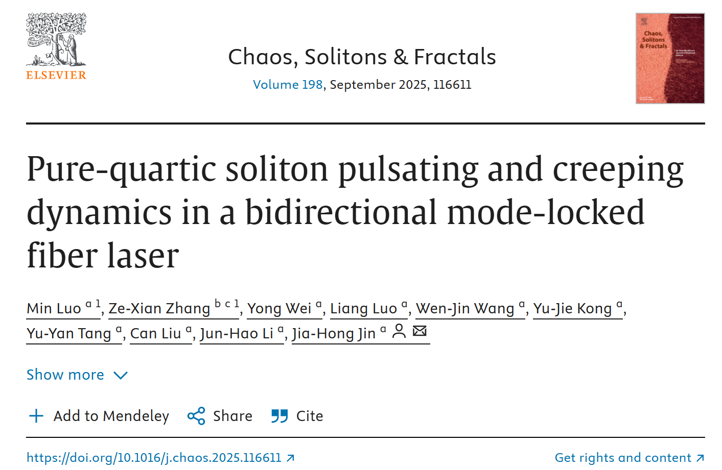 近期,我院先进光学研究团队罗民博士在国际非线性领域学术期刊《Chaos, Solitons & Fractals》(中科院一区TOP,IF=5.3)发表题为“双向锁模光纤激光器中纯四次孤子的脉动和爬行动力学”(Pure-quartic soliton pulsating and creeping dynamics in a bidirectional mode-locked fiber laser)的研究论文。通讯作者为我院金佳鸿博士,论文基本信息如图1。