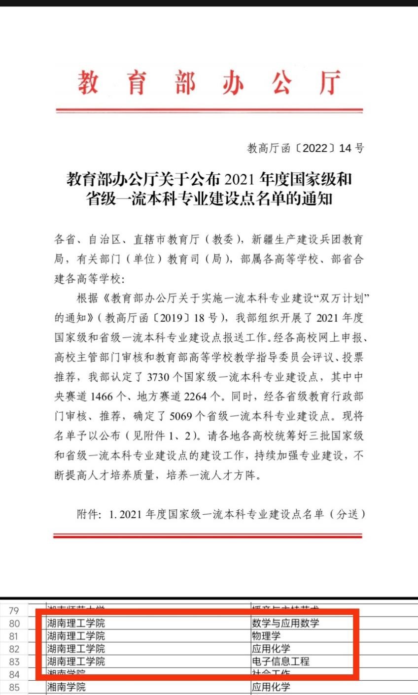 近日,教育部办公厅发文公布了2021年度国家级和省级一流本科专业建设点的评审结果。我院物理学专业获批国家级一流本科专业建设点,这是物理学专业继2020年获批湖南省一流本科专业建设点之后新的里程碑。