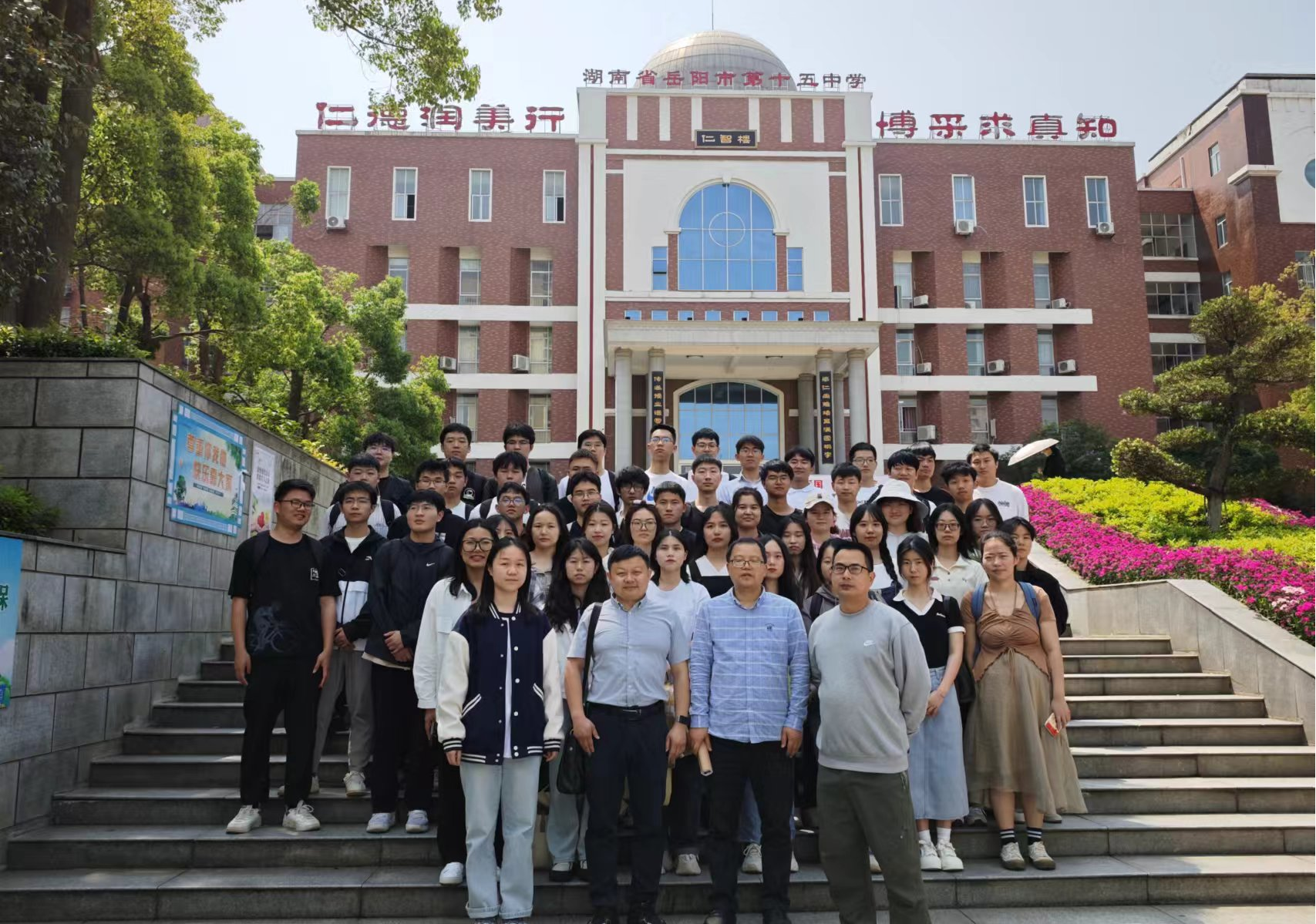 5月28日上午,李科敏、李奇云组织2021级物理学专业全体学生来到岳阳市第一中学参加教育见习活动,认真观摩了岳阳名师、我院优秀校友刘杰老师的《带电粒子在电场中的运动》专题复习课,参加了市一中物理组的教研活动,并参观学习了该校的校园文化建设。