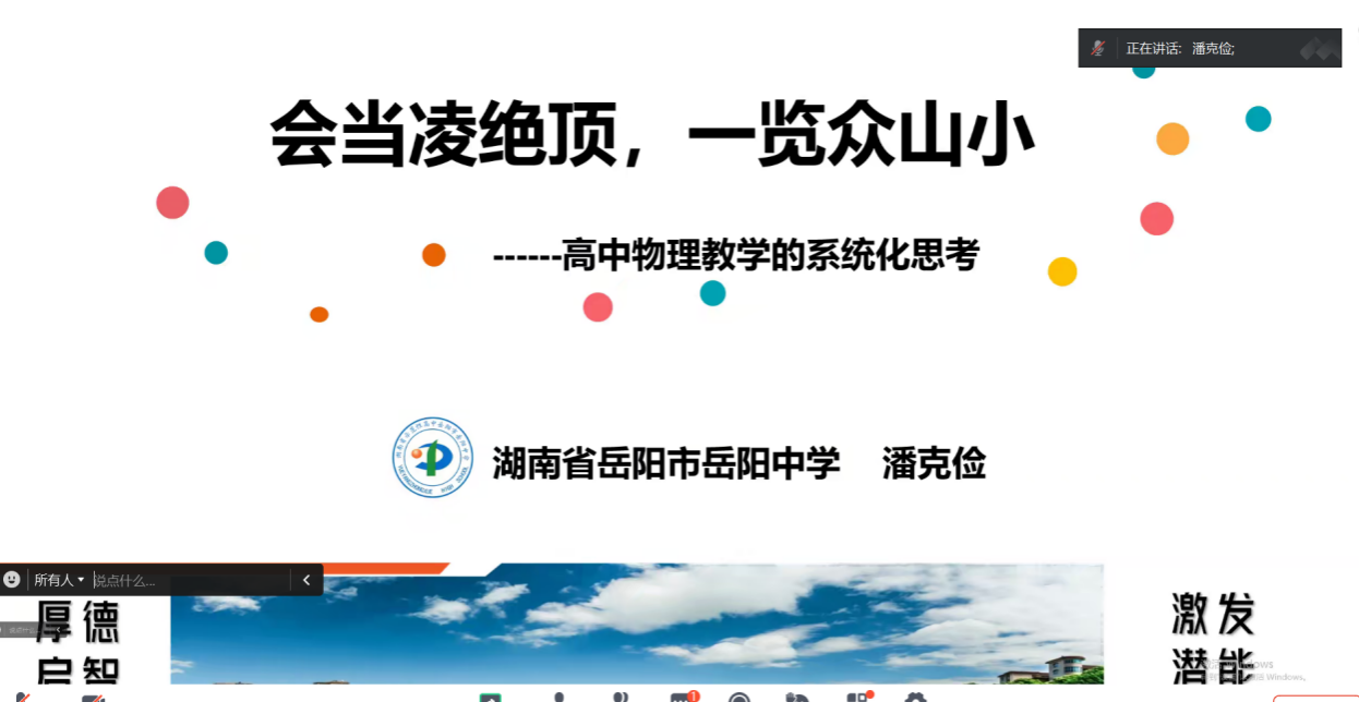湖南省中学物理特级教师、岳阳中学副校长潘克俭以“会当凌绝顶 一览众山小”为题,结合典型案例,从“理论溯源,系统学习”“关注政策,聚焦评价”“系统思考,明晰路径”“实践探索,提升素养”四个层面,指导实习生围绕核心素养,积极开展中学物理教育教学。