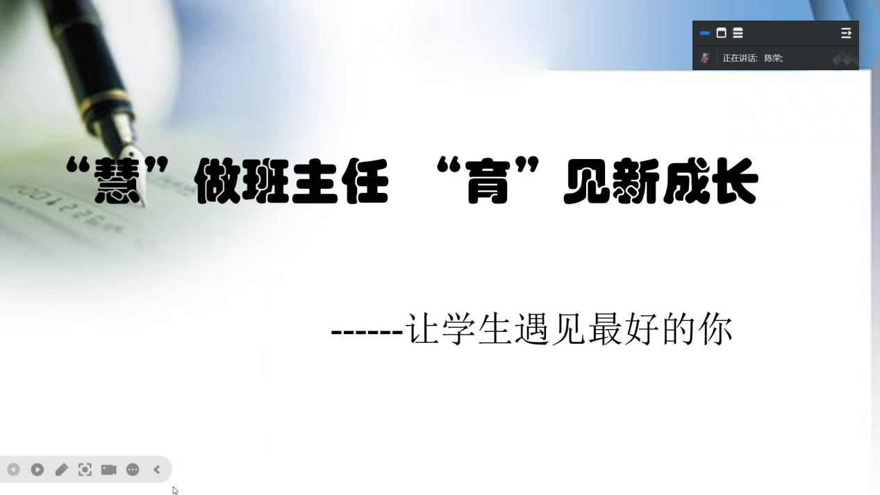 学院优秀校友、岳阳市优秀教师、岳阳市二中校长陈荣以“‘慧’做班主任 ‘育’见新成长”为题,结合自身的经历和经验,阐述了班主任的工作任务、原则和方法、应该具备的素质,她认为班主任必须有五心,即责任心、宽容心、公平心、爱心和细心。