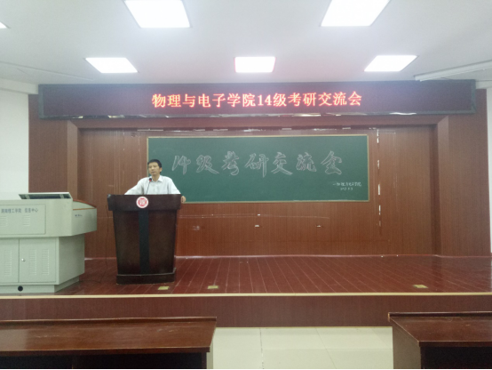 为了激发2018届学生的学习热情和考研激情,增强同学们的考研信心。5月5日下午3点,在物电楼学术报告厅举办了14级考研交流会。物电学院院长李宏民、党总支书记罗文华、4位13级考研成功的学生、14级学生代表刘妍及14级全体学生参加了此次交流会。