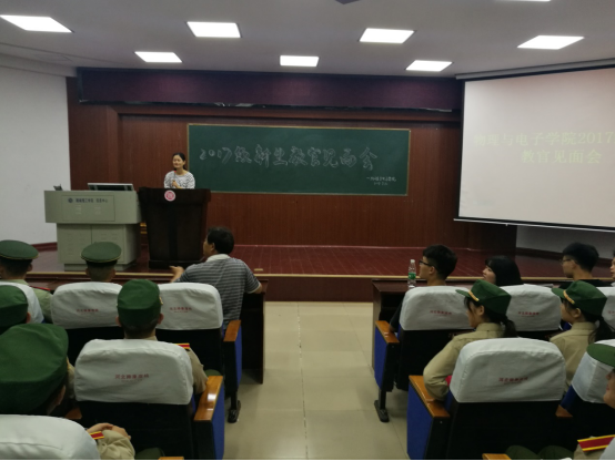 9月10日晚7点,物电学院17级新生教官见面会在6栋学术报告厅举行。岳阳武警支队的朱教官、潘教官,物电学院党总支副书记孙亚辉老师、17级辅导员何小娅老师以及各“军训助管”出席本次会议。