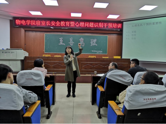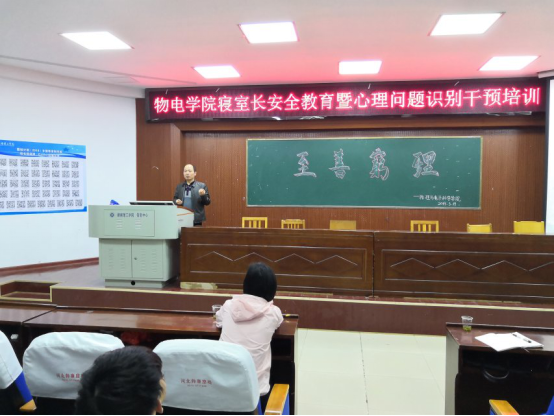 为了加强大学生心理危机干预和心理异常早发现早介入,物电学院于3月19日晚在物电楼学术报告厅召开了物电学院寝室长安全教育暨心理问题识别干预培训。校大学生心理健康中心心理师王莉老师主讲担任此次安全教育讲座,学院党总支副书记张陈武、17级辅导员兼团总支书记何小娅、16级辅导员张恒道出席了本次大会。生活部全体成员、安信部全体成员、心素部全体成员、分管以上三个部门主席团成员以及16至18级寝室长、班级生活委员和心健委员参加了此次培训活动。