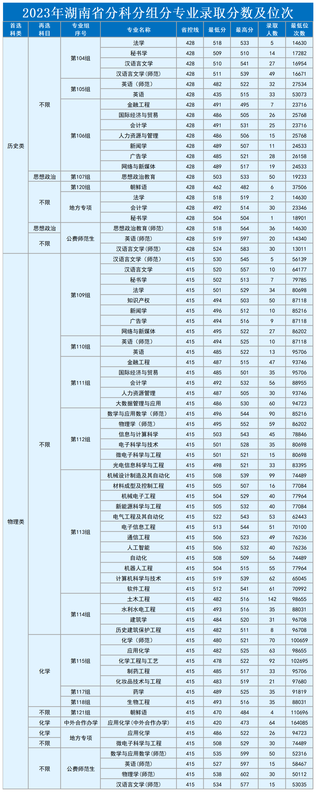WilliamHill中文官方网站2023年湖南省分科分组分专业录取分数及位次