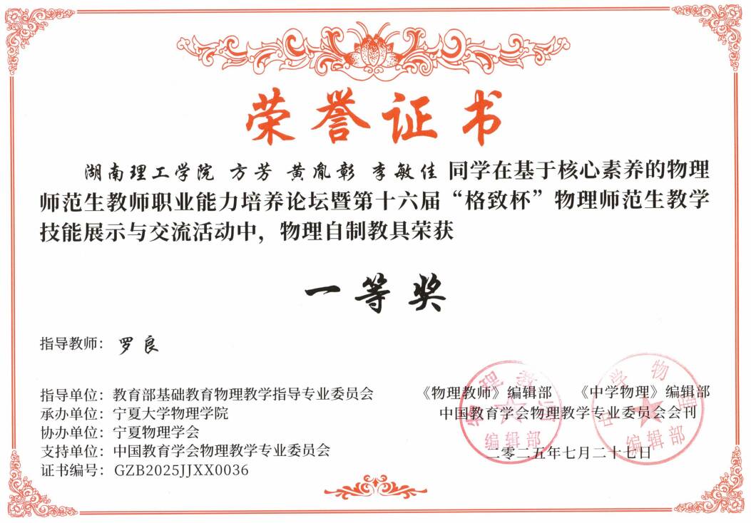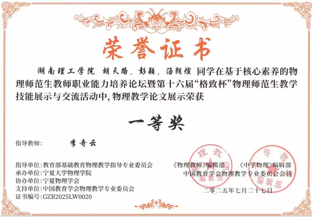 2025年7月,在第十六届“格致杯”物理师范生教学技能展评活动中,我院学子表现优异,WilliamHill中文官方网站荣获优秀组织奖,物理23-1BS班的黄胤彰同学荣获“物理教学展示”一等奖;物理22-1BS班的李志伟、符彬、陶铮同学和物理23-2BS班的方芳、黄胤彰、李敏佳同学,荣获“物理自制教具”一等奖;学科教学(物理)2024级研究生胡天路、彭颖、汤朗煊同学荣获“物理教学论文展示”一等奖;此外,物理22-2BS班的舒铄茹、李享同学,物理23-1BS班的李诗扬同学,物理23-2BS班的王秋怡同学,学科教学(物理)2024级研究生彭颖、胡天路等同学荣获“物理教学展示”二等奖,物理23-2BS班的廖艳虹同学荣获“物理教学展示”三等奖;物理22-2BS班的孙静怡、董心慈、李享同学,物理23-2的张雅卉同学荣获“物理自制教具”二等奖,李诗扬、彭颖、胡天路的物理教具荣获三等奖;黄胤彰、董心慈、侯心怡、曾家豪、彭颖、胡天路等人的物理教学论文荣获二等奖。