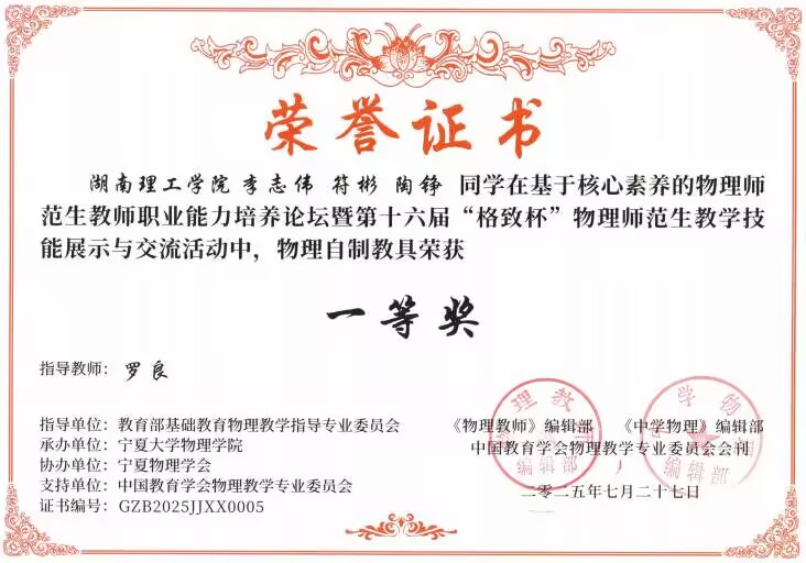 2025年,物电学院学子积极参加各类学科教学比赛,在湖南省师范生教学技能竞赛,以及“田家炳杯”“华夏杯”“格致杯”等全国物理师范生教学竞赛中取得了优异成绩,在一定程度上凸显了我院物理学专业人才培养成效。